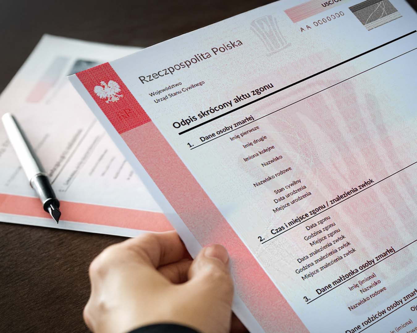 Podstawowo: karta zgonu, odpis aktu zgonu, dowód osobisty osoby zmarłej oraz osoby załatwiającej formalności. W razie braków – Foltys 24h pomoże je uzyskać (USC, ZUS, parafia).